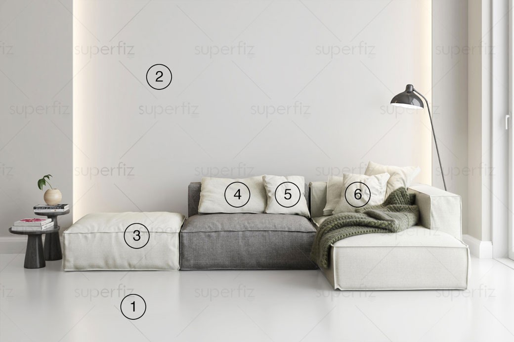 Mockup de Sala de Estar para cambiar la superficie del suelo, pared y cojines
