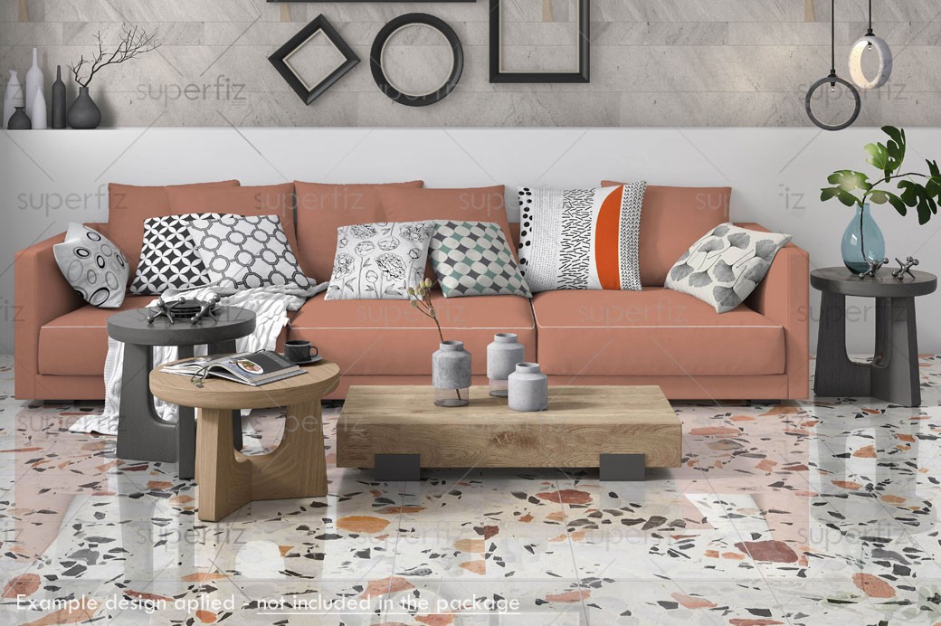 Mockup de Salón para mostrar el diseño de la superficie del suelo, de la pared y/o cojines con un resultado fotorrealista.